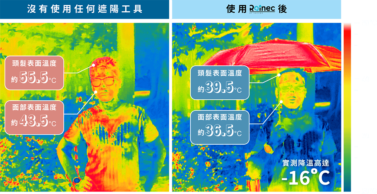 在晴天,環境温度34.5°C的戶外,一名成年人直接被太陽照射,以及在使用Rainec晴雨遮的温度對比: