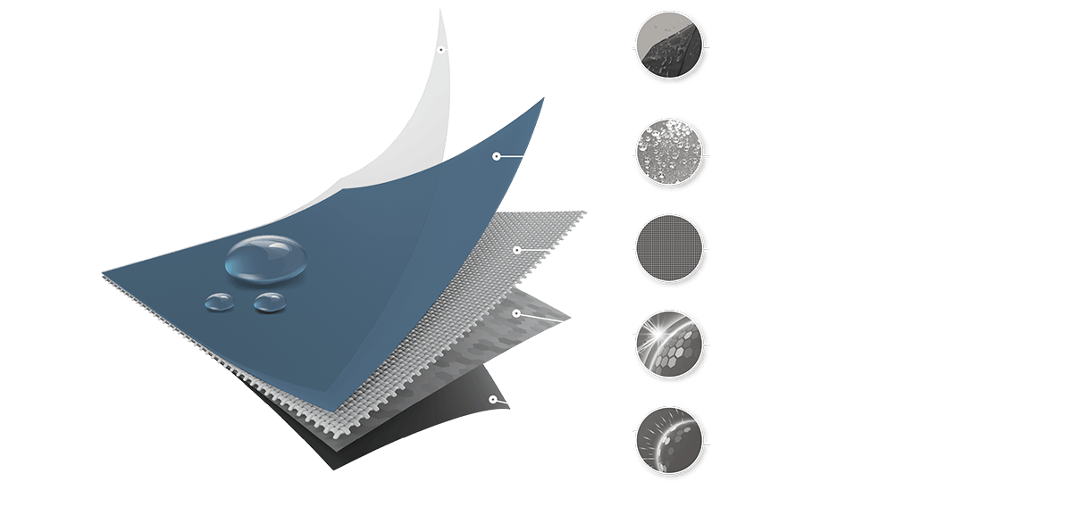 特製純黑不透光底層,實現零透光,有效遮擋100%可見光。阻隔熱力穿透,即時降溫。